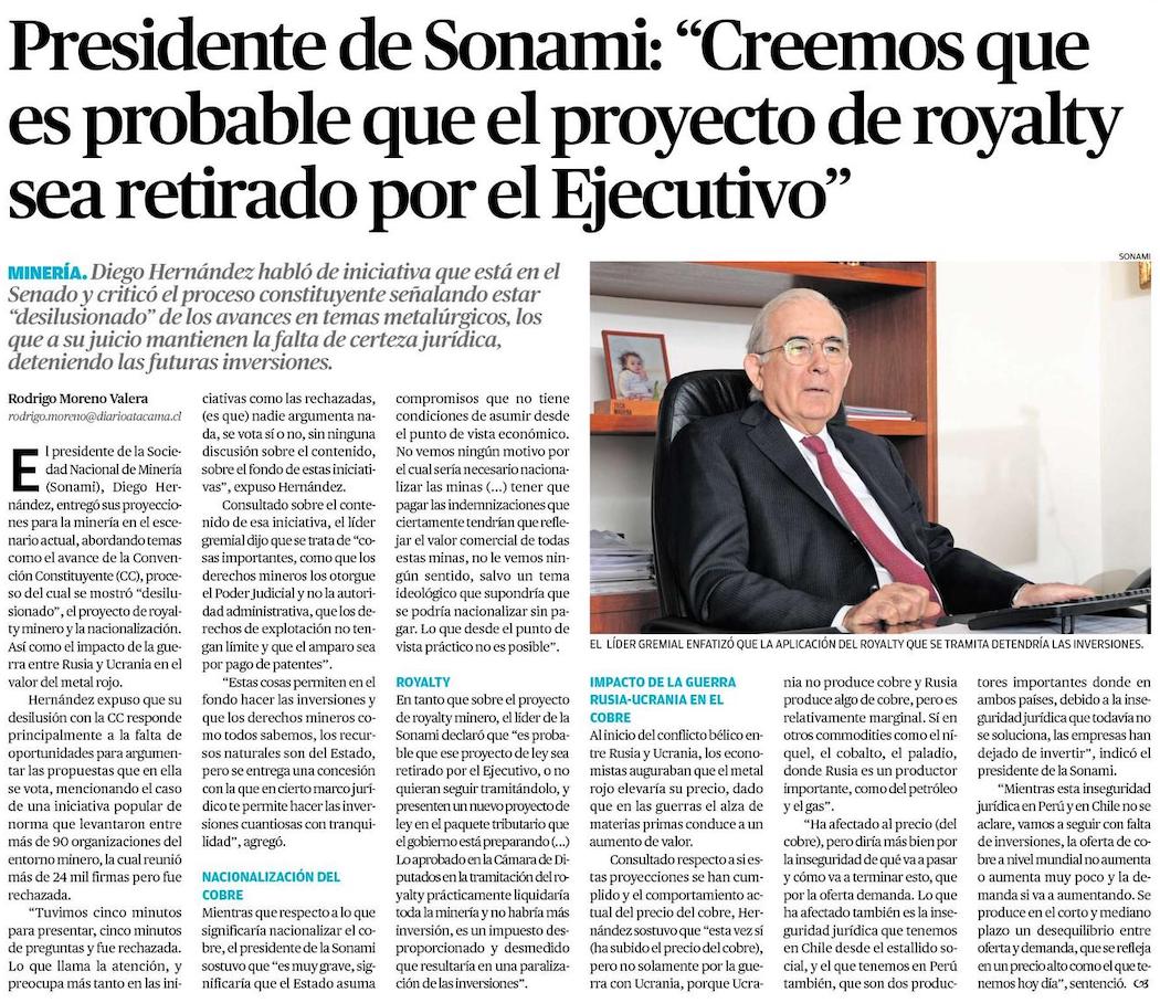 Noticias Sala de Prensa “Creemos que es probable que el proyecto de royalty sea retirado por el Ejecutivo”