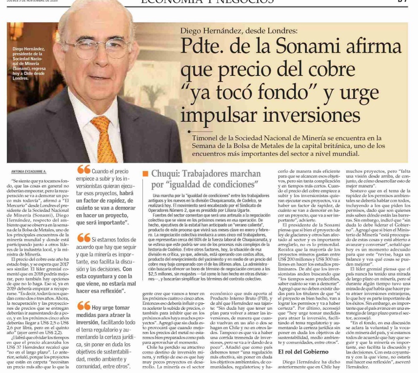 Noticias Sala de Prensa Diego Hernández afirma que precio del cobre “ya tocó fondo” y urge impulsar inversiones
