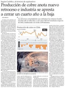 Producción de cobre anota nuevo retroceso e industria se apresta a cerrar un cuarto año a la baja noviembre 4, 2022 Leer más »