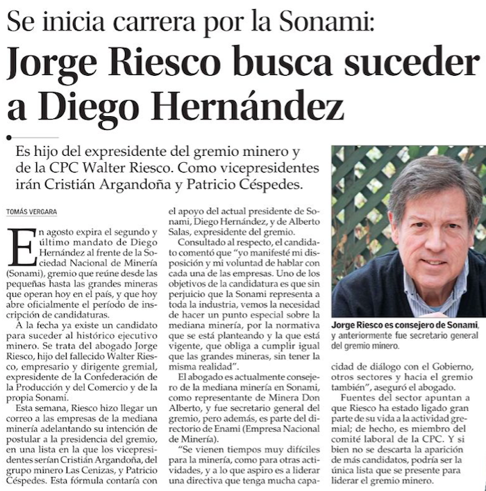 Presidencia de la SONAMI: Jorge Riesco busca suceder a Diego Hernández