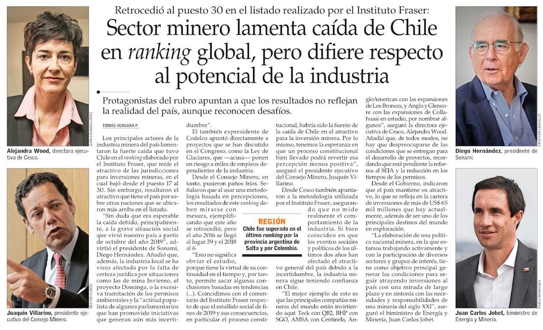 Noticias Sala de Prensa Sector minero lamenta caída de Chile en ranking global, pero difiere respecto al potencial de la industria