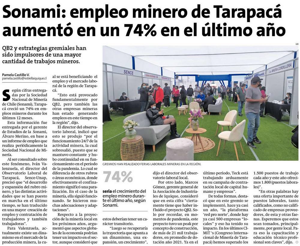 SONAMI: empleo minero de Tarapacá aumento en un 74% en el último año