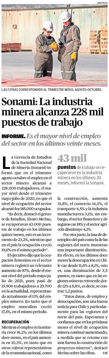 SONAMI: La industria minera alcanza 228 mil puestos de trabajo