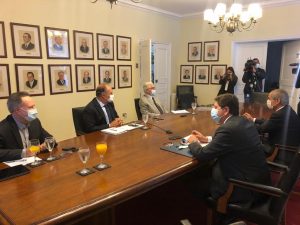 En reunión con el ministro del Interior, Rodrigo Delgado, y el subsecretario de la cartera, Juan Francisco Galli, en la sede de la Confederación de