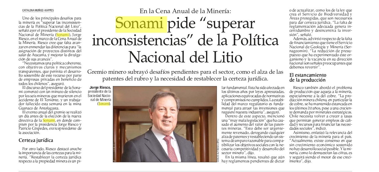 Año a año realizamos Cursos de Minería para Periodistas, cuyo objetivo es entregar a los representantes de los medios de comunicación una visión integrada, profesional y de negocios de la industria, y actualizar conocimientos sobre el sector minero nacional. En esta sección, podrán encontrar las principales noticias de nuestra asociación gremial, así como imágenes de nuestras actividades y publicaciones en los principales medios del país.